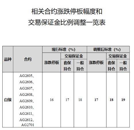 白银期货AG2605、AG2606、AG2607、AG2608、AG2609、AG2610、AG2611、AG2612、AG2701合约的涨跌停板幅度从16%调整为17%,套保持仓交易保证金比例从17%调整为18%,一般持仓交易保证金比例从18%调整为19%。