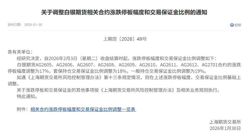 1月30日,上海期货交易所发布通知,自2026年2月3日(星期二)收盘结算时起,涨跌停板幅度和交易保证金比例调整如下:
